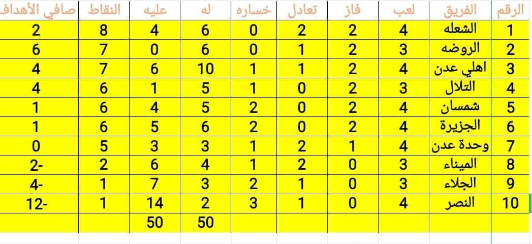 وحدة عدن المركز السابع بخمس نقاط من اربع مباريات.