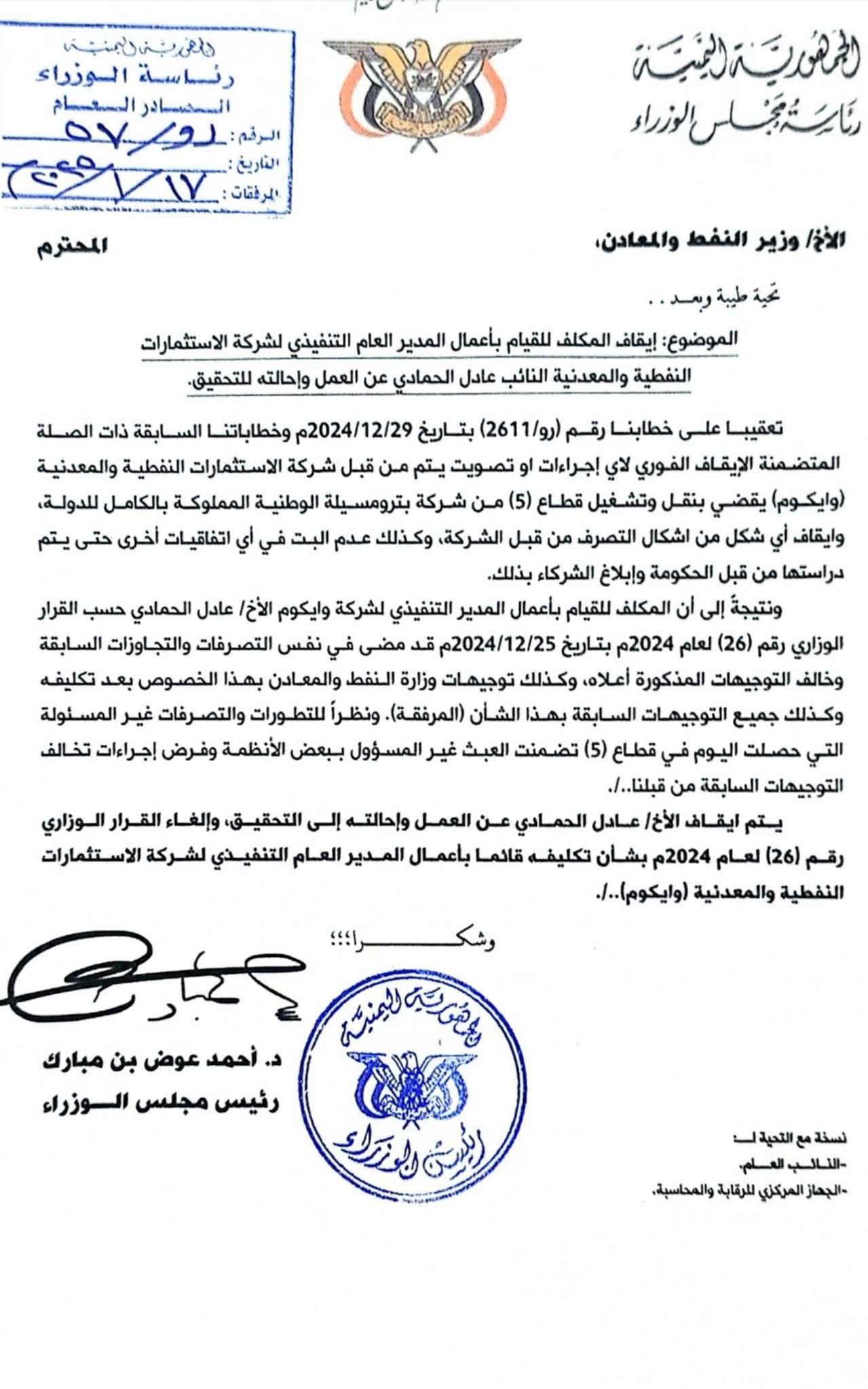 أصدر رئيس مجلس الوزراء د. أحمد عوض بن مبارك قرارًا بإيقاف المكلف للقيام بأعمال المدير العام التنفيذي لشركة الاستثمارات النفطية والمعدنية النائب عادل الحمادي عن العمل وإحالته للتحقيق مع إلغاء القرار الوزاري الصادر سابقًا بتكليفه بأعمال المدير التنفيذي للشركة.