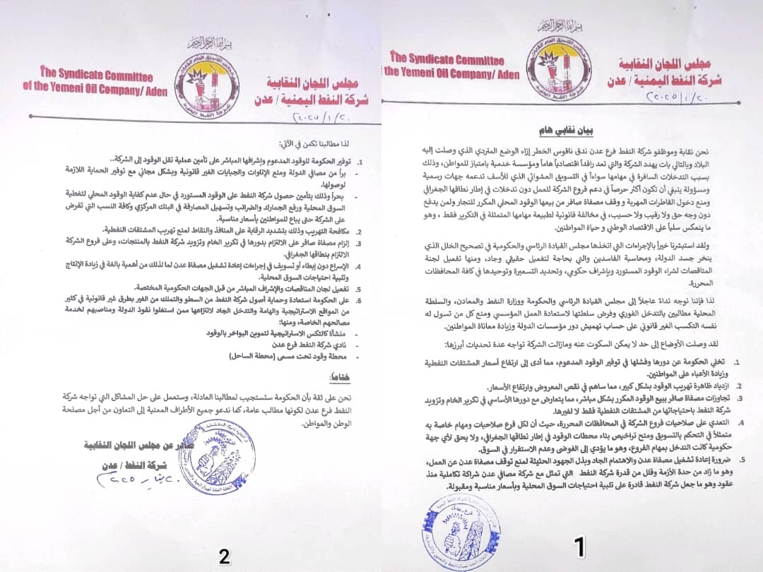 نحن نقابة وموظفو شركة النفط عدن ندق ناقوس الخطر إزاء الوضع المتردي الذي وصلت إليه البلاد وبالتالي بات يهدد الشركة والتي تعد رافداً اقتصادياً هاماً ومؤسسة خدمية بامتياز للمواطن، وذلك بسبب التدخلات السافرة في مهامها سواء في التسويق العشوائي الذي للاسف تدعمه جهات رسمية ومسؤولة ينبغي أن تكون أكثر حرصاً في دعم فروع الشركة للعمل دون تدخلات في إطار نطاقها الجغرافي ومنع دخول القاطرات المهربة و وقف مصفاة صافر من بيعها الوقود المحلي المكرر للتجار ولمن يدفع دون وجه حق ولا رقيب ولا حسيب، في مخالفة قانونية لطبيعة مهامها المتمثلة في التكرير فقط ، وهو ما ينعكس سلباً على الاقتصاد الوطني وحياة المواطنين.