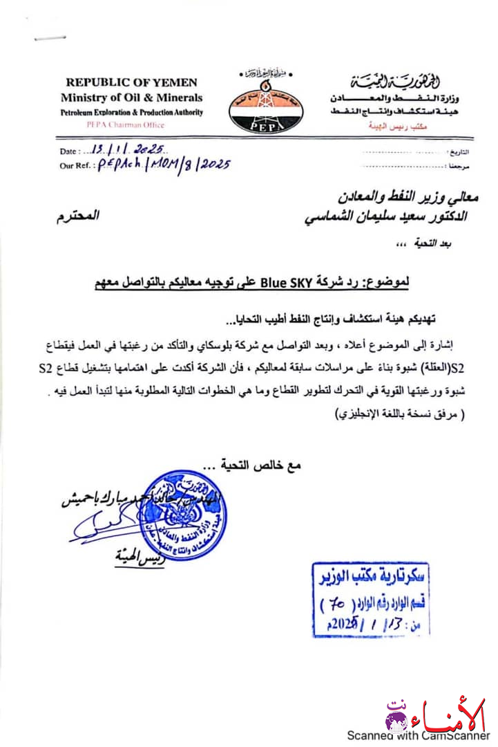 وأشارت وثيقة رسمية موجهة من رئيس هيئة استكشاف وإنتاج النفط، مبارك باحميش إلى وزير النفط، إلى التوجه لاختيار شركة “بلو سكاي” لتكون المشغل الجديد للقطاع.
