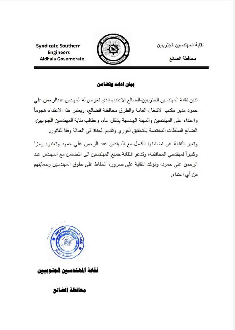 تدين نقابة المهندسين الجنوبيين فرع الضالع الاعتداء الذي تعرض له المهندس عبدالرحمن علي حمود مدير عام مكتب الاشغال العامه والطرق بمحافظة الضالع ويعتبر هذا الاعتداء هجوما واعتداء على المهندسين والمهنة الهندسية بشكل عام وتطالب نقابة المهندسين الجنوبيين الضالع السلطات المختصة بالتحقيق الفوري وتقديم الجناة الى العدالة وفق القانون.