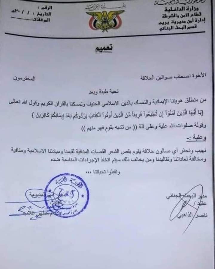 وبحسب وثيقة صادرة عن ادارة امن مدينة يريم وسط اليمن: فقد توعدت باتخاذ اجراءات ضد ملاك صوالين قصات الشعر، في حال تنفيذها قصات” منافية لقيمنا ومبادئنا الاسلامية وعادتنا وتقاليدنا”.