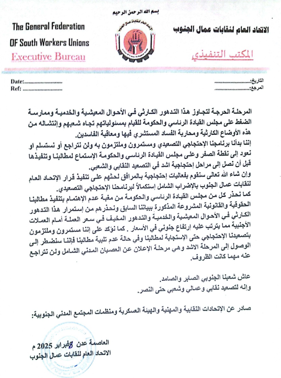 اصدر الاتحاد العام لنقابات عمال الجنوب ومعه بقية الاتحادات النقابية والمهنية والهيئة العسكرية ومنظمات المجتمع المدني الجنوبية بيانا هاما مفاده التهديد بإعلان العصيان المدني الشامل يومنا هذا السبت الموافق 8فبراير 2025م