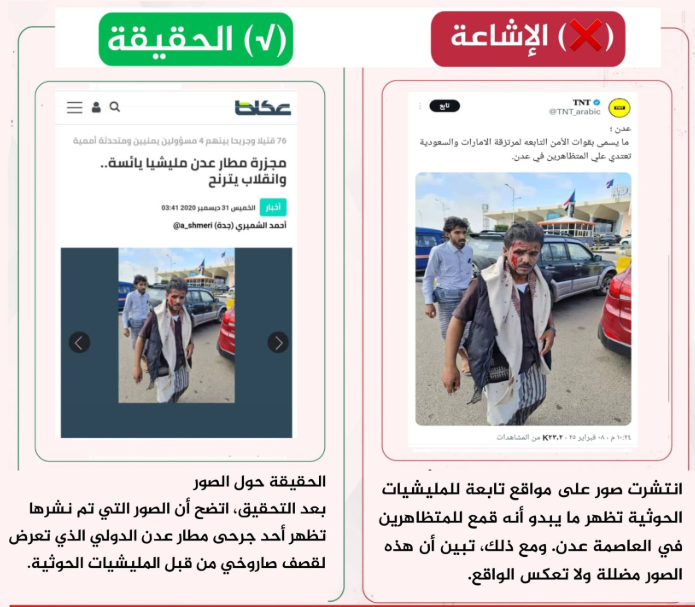 وتؤكد الحقيقة حول الصور المتداولة، وفقًا للتحقيقات، أن الصور تعود إلى أحد جرحى الهجوم الصاروخي الذي استهدف مطار عدن الدولي، وليس لها أي علاقة بمظاهرات أو عمليات قمع داخل العاصمة.