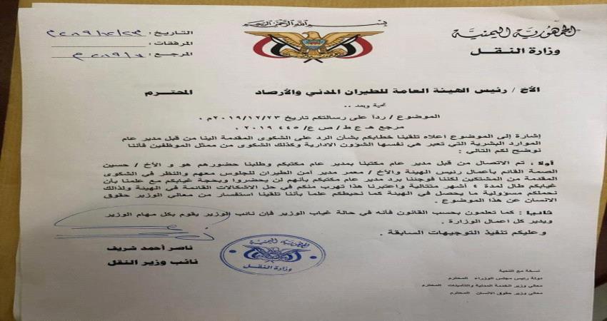 وجاء في المذكرة المرفقة التي وجهها نائب وزير النقل لرئيس هيئة الطيران وحصلت عدن تايم على نسخة منها: تلقينا شكوى من مدير الموارد البشرية بالهيئة ابوبكر المعلمي بخصوص الاعتداء والتهجم عليه من قبل مدير عام امن الطيران بالهيئة لأكثر من مرة، وكذلك شكوى من م.