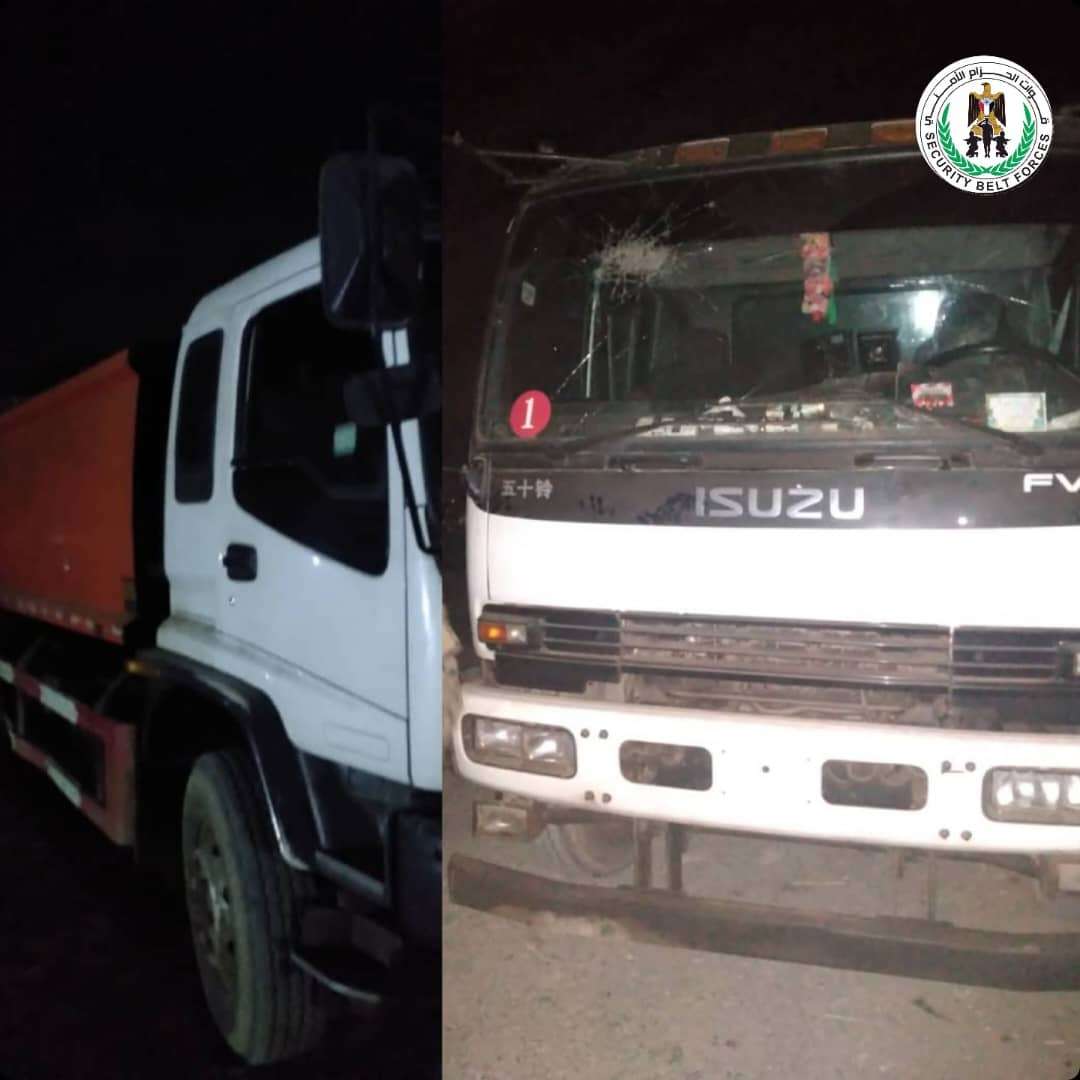استعادت قوات الحزام الأمني في محافظة أبين شاحنة نوع “دينا” تابعة للبلدية في مديرية خنفر بعد ساعات من اختطافها.