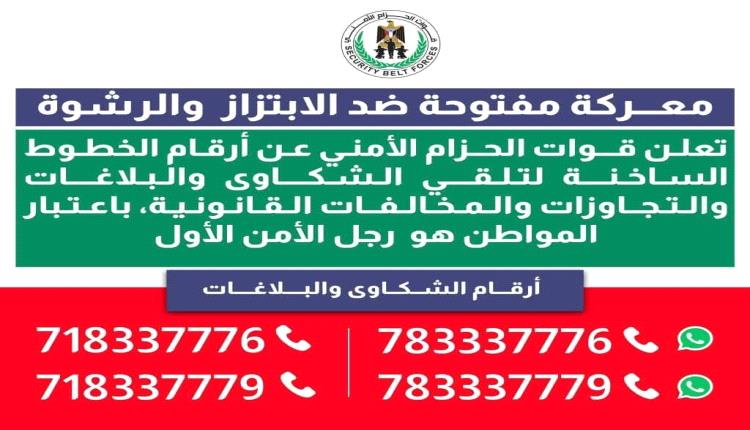 عممت قوات الحزام الأمني أرقام الخطوط الساخنة للمواطنين لتلقي الشكاوي والبلاغات عن التجاوزات والمخالفات القانونية تحت شعار معركة مفتوحة ضد الابتزاز والرشوة.