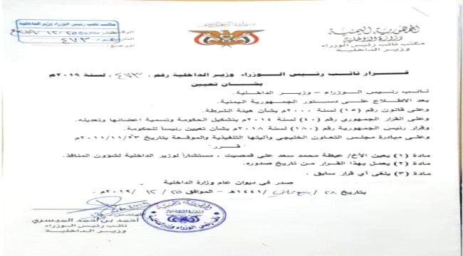 اصدر وزير الداخلية في الحكومة الشرعية احمد الميسري مؤخرا قرارا بتعيين مواطن عماني مستشارا له لشؤون المنافذ .