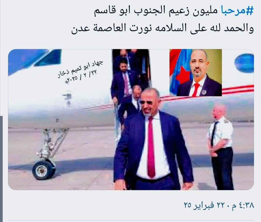 حطت عجلات الطائرة في مدرج مطار عدن الدولي وارتصت الصفوف للشخصيات والهامات السياسية الجنوبية وذلك لاستقبال الرئيس القائد (عيدروس الزُبيدي) ،رئيس المجلس الانتقالي الجنوبي، نائب رئيس مجلس القيادة الرئاسي القائد الأعلى للقوات المسلحة الجنوبية قبل قليل قادمًا من دولة الإمارات العربية المتحدة، بعد جولة خارجية شارك خلالها في عدد من المنتديات والمؤتمرات الدولية.
