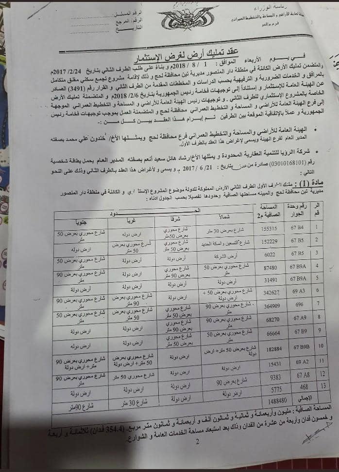 وتوضح الوثيقة أن العقد الذي أُبرم بين الهيئة العامة للأراضي في لحج، ممثلة بمديرها العام خلدون علي محمد، وشركة الرؤيا للتنمية العقارية المحدودة، التي يمثلها رشاد هائل سعيد أنعم، تم توقيعه في أغسطس 2018. وبموجب هذا العقد، تم تمليك الأرض الواقعة في منطقة دار المنصور بمديرية تبن لإقامة مشروع سكني استثماري مغلق يشمل خدمات ترفيهية وضرورية، وهو ما يكشف حجم الفساد ونهب اراضي الدولة والمواطنين الذي طال محافظة لحج وبتوجيهات رئاسية.