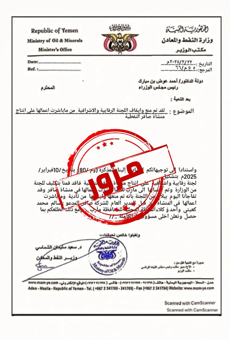 نفى مصدر مسؤول بوزارة النفط والمعادن في العاصمة عدن، صحة الوثيقة التي يجري تداولها على منصات التواصل الاجتماعي، بشأن مذكرة رفعها معالي وزير النفط والمعادن، الى رئيس الوزراء الدكتور أحمد عوض بن مبارك.