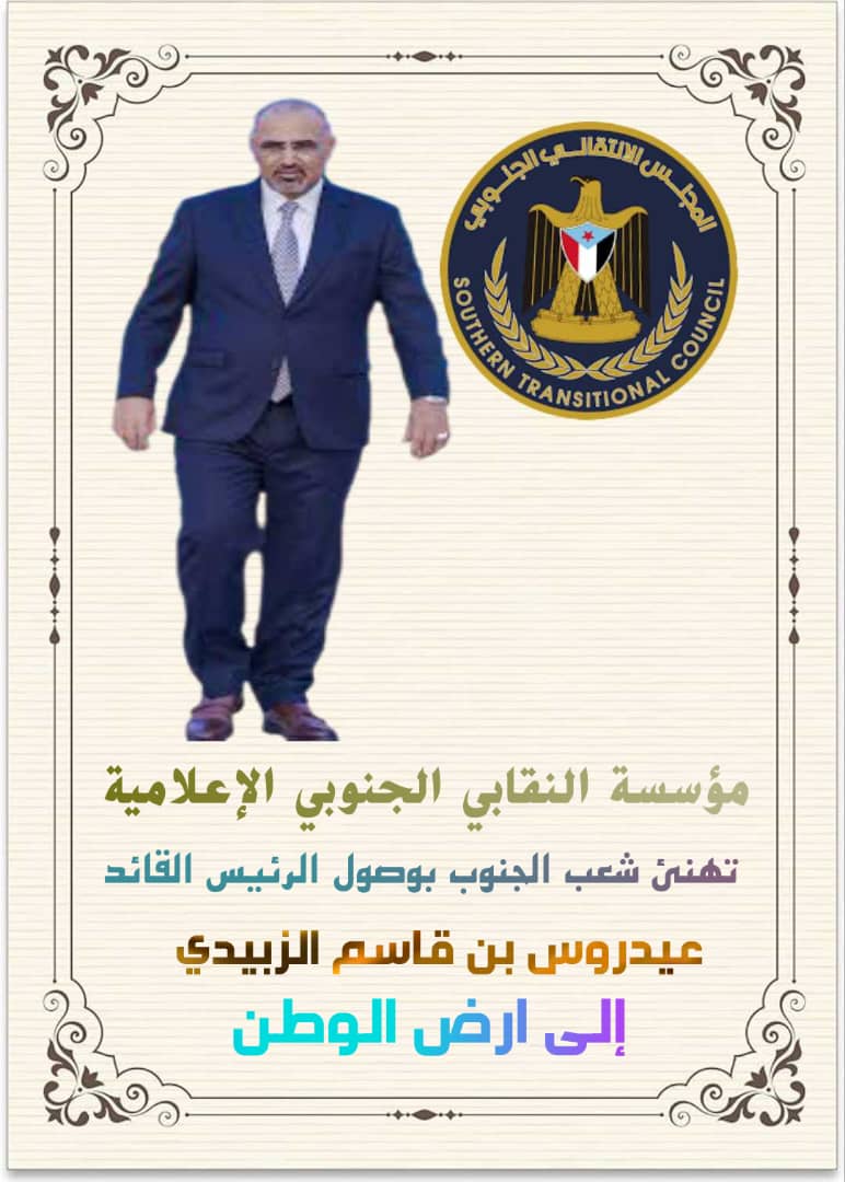 بوصول قائدنا عيدروس، تغني عدن وبعود الوتر، وأبين تغرد بأجمل لحن. وهذه هي الضالع، يتشعشع نورها من أعالي الجبال الشامخة، مشتاقة لوصول البطل..وشبوة تعزف لنا ألحان تاريخ الجنوب، وأبطال الوطن. وحضرموت، أرض السلام، ترحب بالأسد المظفر، حامل الراية والأمجاد. كل أرض الجنوب ترحب بالقائد البطل، قائدنا ألفذ، والليث المحارب، حامل قضية شعب صنديد، مايلين. وقف العالم له متحديًا كل المحن، يصدح بصوت الحق: لن نتراجع عن قضيتنا، مهما حاربتم وعطلتم وأقصيتم وظلمتم، فإننا عن دولتنا أبدًا لن نميل.