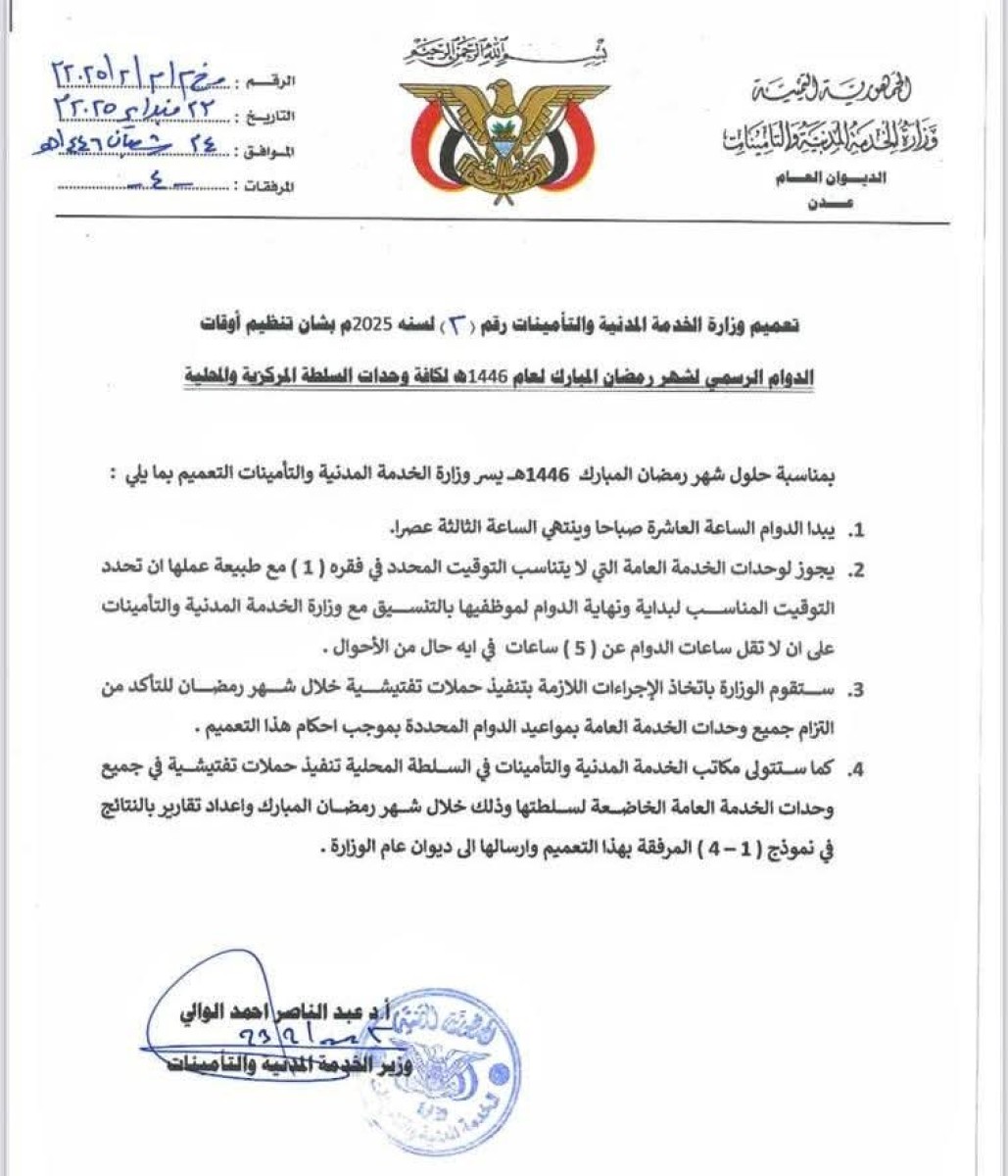 أصدرت وزارة الخدمة المدنية والتأمينات في العاصمة عدن، اليوم الثلاثاء، تعميمًا رقم (3) لسنة 2025م بشأن تنظيم أوقات الدوام الرسمي خلال شهر رمضان المبارك 1446هـ، لكافة وحدات السلطة المركزية والمحلية.