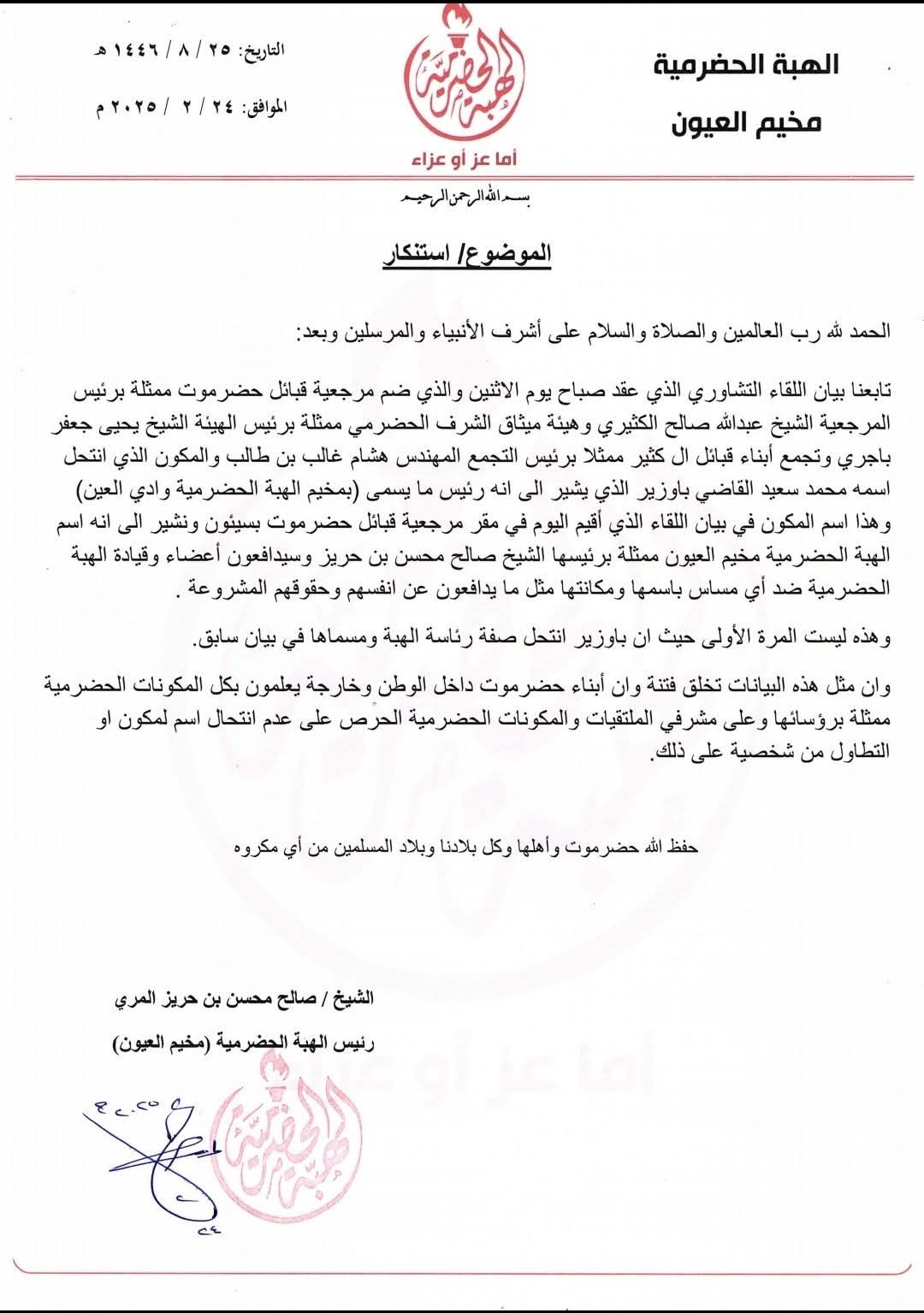 وتأكيدا لذلك اصدر مايسمي نفسه رئيس الهبة الحضرمية مخيم العيون ” صالح بن حريز المري ” بيانا استنكر فيه انتحال شخص آخر رئاسة الهبة بالعيون وقال في بيانه بلغة التهديد إن قيادة الهبة واعضاؤها سيدافعون عن مكونهم مثلما يدافعون عن انفسهم