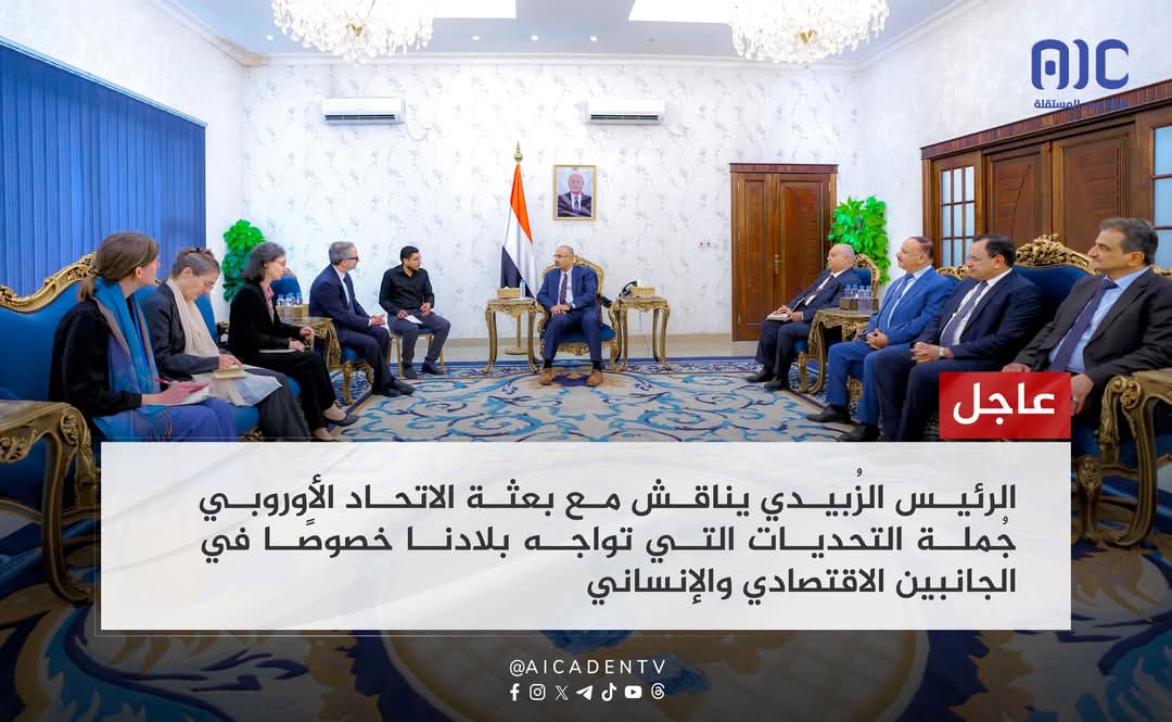 عاجل/ الرئيس الزُبيدي يناقش مع بعثة الاتحاد الأوروبي جُملة التحديات التي تواجه بلادنا خصوصًا في الجانبين الاقتصادي والإنساني
