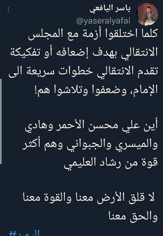 قال الصحافي الجنوبي الدكتور / ياسر اليافعي ،رئيس تحرير موقع يافع نيوز في تغريدة له بصفحته الشخصية بصفحات التواصل الاجتماعي قال : كلما اختلقوا أزمة مع المجلس الانتقالي الجنوبي بهدف اضعافه وتفكيكه تقدم الانتقالي خطوات سريعة إلى الامام ،وضعفوا وتلاشواهم!