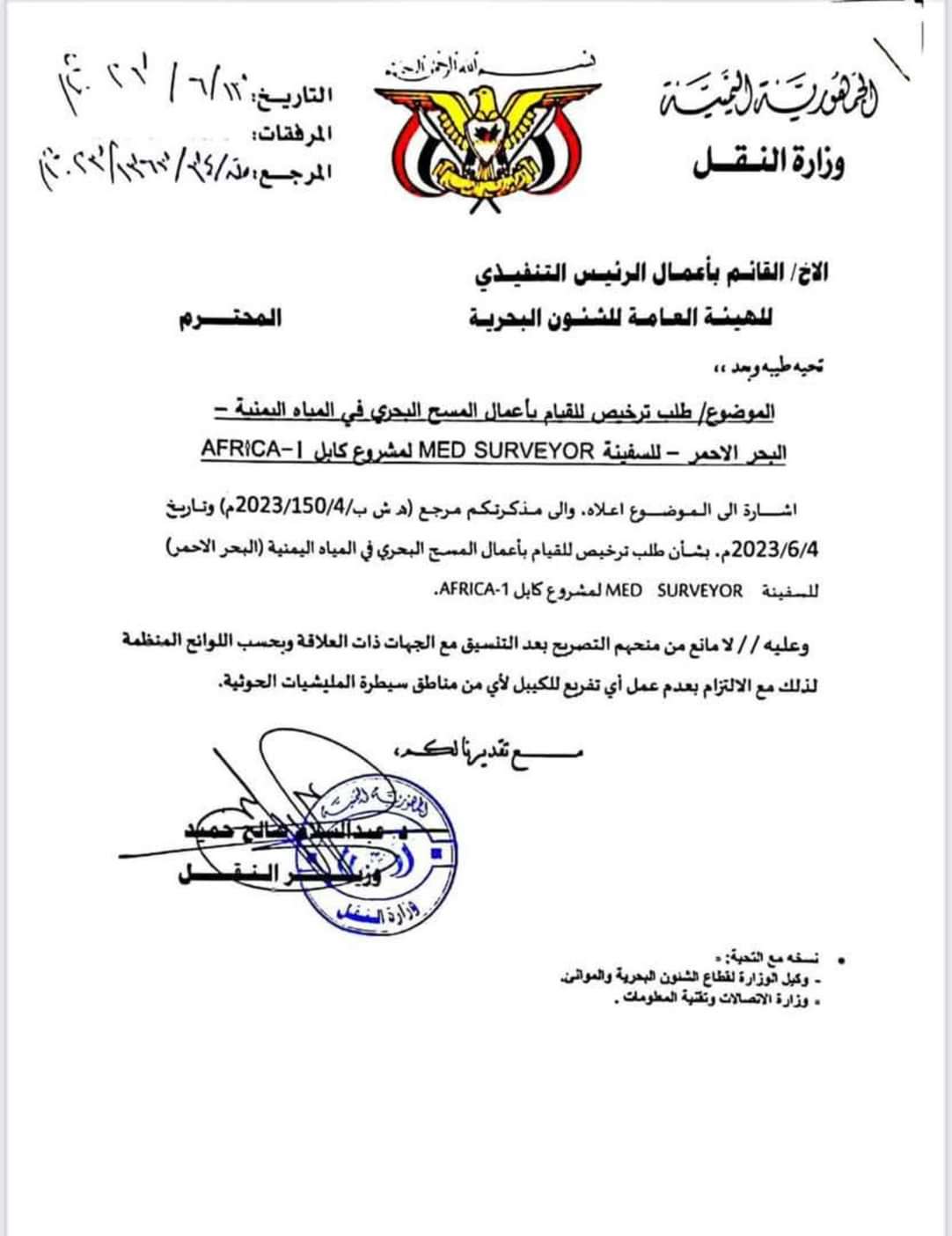 وعليه/لأمانع من منحهم التصريح بعد التنسيق مع الجهات ذات العلاقة وبحسب اللوائح المنظمة لذلك مع الإلتزام بعدم عمل أي تفريع للكيبل لأي من مناطق سيطرة الحوثيين