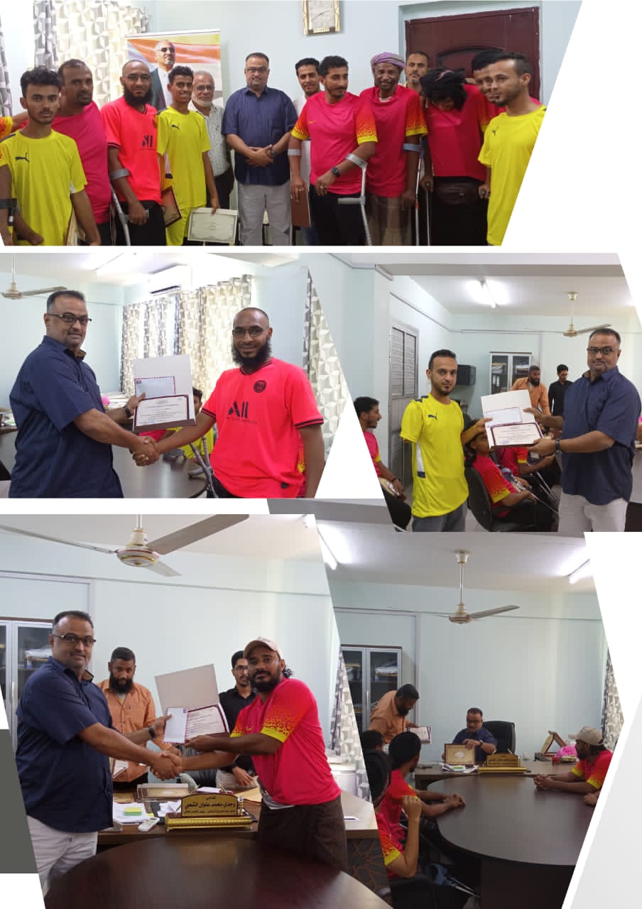 في لفتة إنسانية ورياضية رائعة، كرّم القاضي وجدي محمد الشعبي، مدير عام مديرية التواهي، أبطال فريق كرة القدم للمبتورين، الذين أظهروا روحاً رياضية عالية في مباراتهم الأخيرة على ملعب الحبيشي، والتي انتهت بالتعادل مع فريق تعز.