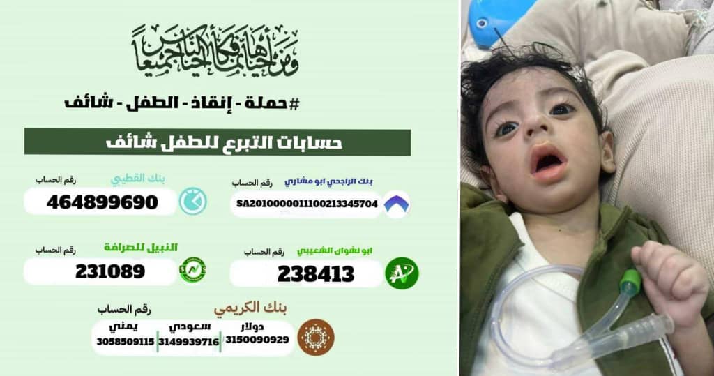 ناشطون يطلقون حملة تبرعات عاجلة من أجل إنقاذ حياة الطفل ”شائف نبيل الحريري”