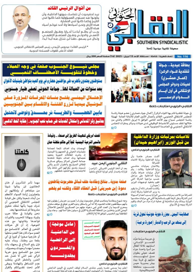 صحيفة[ النقابي الجنوبي] تعاود الصدور ..العدد الجديد (116) يحمل ملفات ساخنة .. يوم غدا الأحد الموافق 13/4/2025