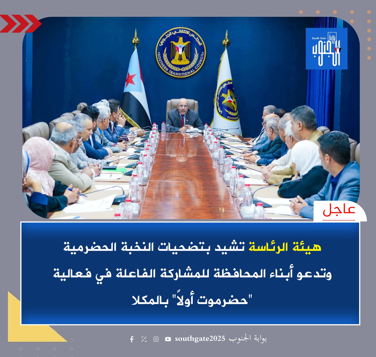 هيئة رئاسة الانتقالي تشيد بالنخبة وتدعو ألمواطنين للمشاركة في الفعالية وتحذر من محاولات لإثارة الفوضى أو تغذية التوترات بحضرموت