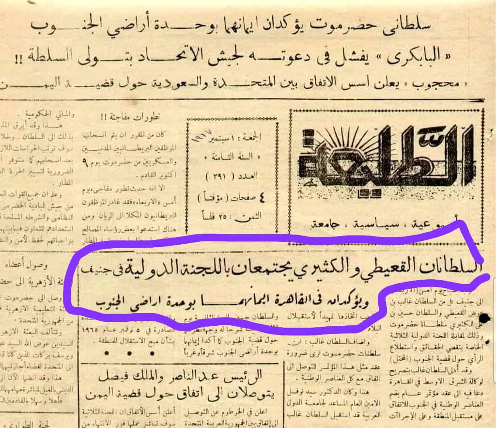 ردا على مرضى الفتنة وأصحاب العمائم الملطخة بالدماء التابعة للمحتل اليمني وانصارهم في الداخل الجنوبي بان سلاطين حضرموت (القعيطي والكثيري) يجتمعان باللجنة الدولية في جنيف عام 1967م ويؤكدان في القاهرة ايمانهما بوحدة أراضي الجنوب