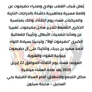 نهيب بجميع أبناء وادي وصحراء حضرموت وكافة الشرائح الاجتماعية المشاركة الفاعلة لإنجاح المسيرة السلمية، ولنرفع الصوت عاليا: حضرموت لن تُختطف… حضرموت جنوبية الهوى والهوية.