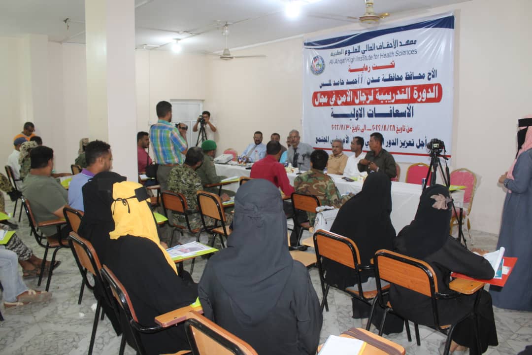 برعاية وزير الدولة محافظ محافظة عدن الأخ احمد حامد لملس .. و تحت شعار ٫ من أجل تعزيز الدور الانساني لافراد الشرطة في المجتمع.. بدأت صباح اليوم في معهد الاحقاف العالي للعلوم الصحية بالعاصمة المؤقتة عدن، الدورة التدريبية بمجال الاسعافات الاولية ل 25 من افراد شرطة العاصمة عدن ..تهدف على مدى ثلاثة ايام، تزويدهم بالمعارف والمهارات النظرية والتطبيقية بطرق الاسعاف لحالات الاختناق والانفجارات والنزيف والحروق والكسور بانواعها وكيفية الإنعاش القلبي التنفسي والطرق الآمنة لنقل المصابين من مواقع الخطر اضافة إلى التعريف بأهداف ومسؤوليات المسعف الاخلاقية والمهنية تجاه المصابين.