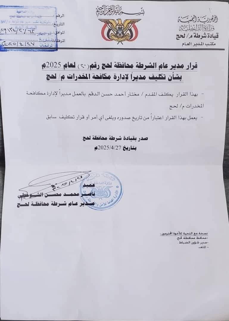 نحو تعزيز الأداء الأمني وتحسين مستوى الكفاءة لدى أجهزة مكافحة المخدرات أصدر مدير أمن محافظة لحج، العميد الركن ناصر الشوحطي، قرارًا بتكليف المقدم مختار أحمد حسن الدقم مديرًا لإدارة مكافحة المخدرات في أمن المحافظة.