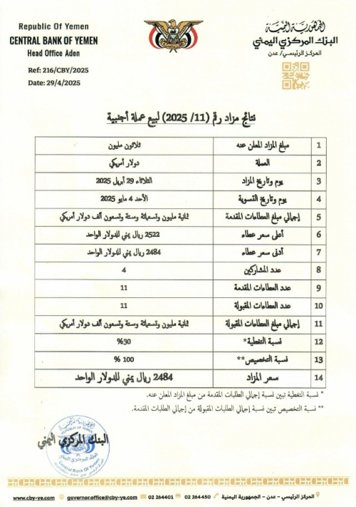 يذكر بأن البنك المركزي عدن أعلن اليوم الثلاثاء الموافق 29/4/2025 عن نتائج لبيع عملة أجنبية والمعلن عنها يوم الثلاثاء الماضي