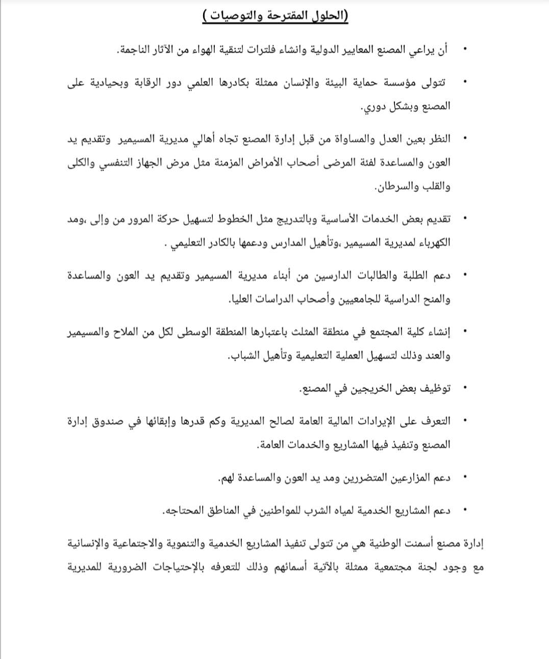 – النظر بعين العدل والمساواة من قبل إدارة المصنع تجاه أهالي مديرية المسيمير وتقديم يد العون والمساعدة لفئة المرضى ممن يعانون الأمراض المزمنة كأمراض الجهاز التنفسي والكلى والقلب والسرطانات.