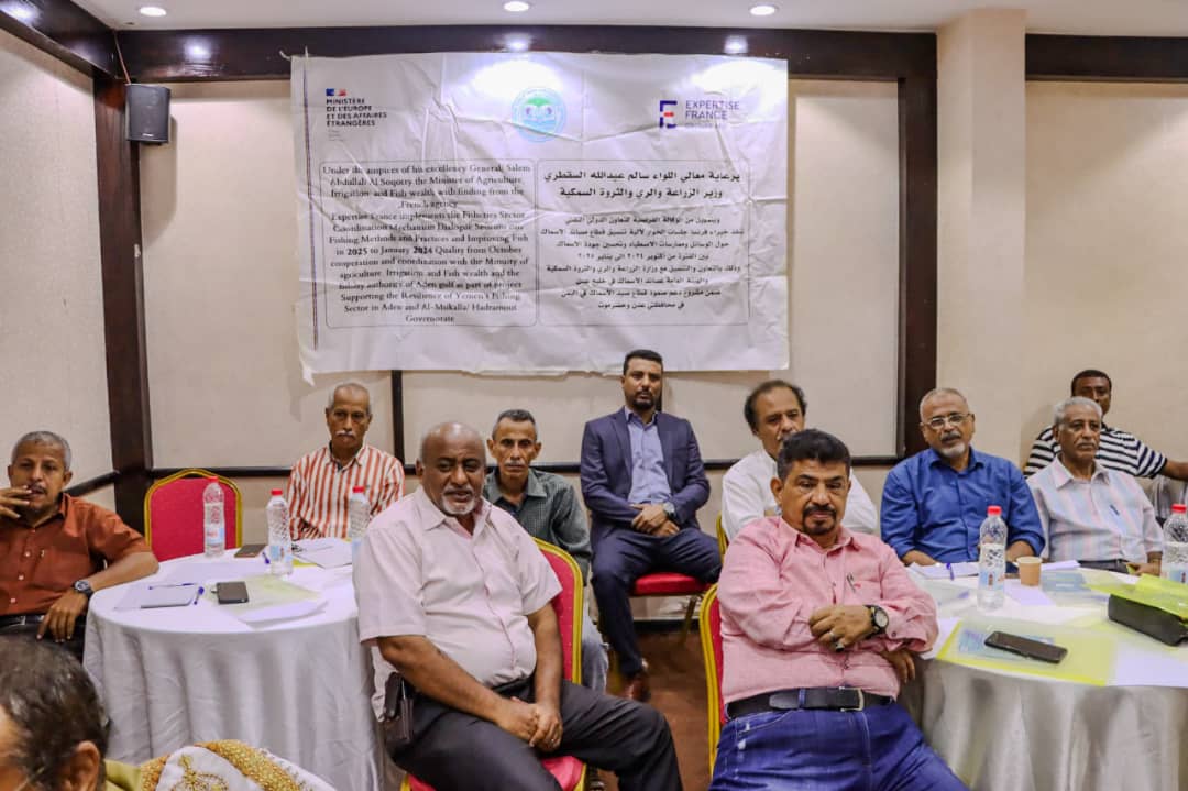 برعاية وزير الزراعة والري والثروة السمكية اللواء سالم السقطري دُشّنت اليوم بعدن فعاليات جلسات الحوار لآلية تنسيق قطاع مصائد الأسماك حول الوسائل وممارسات الإصطياد وتحسين جودة الأسماك تنفذها خبراء فرنسيين بتمويل من الوكالة الفرنسية للتعاون الدولي وذلك بالتعاون والتنسيق مع وزارة الزراعة والري والثروة السمكية والهيئة العامة للمصائد السمكية عدن ضمن مشروع دعم صمود قطاع صيد الأسماك في محافظتي عدن وحضرموت مستهدفة عدد من المسؤولين والباحثين والمهنيين والمهتمين من ذوي الاختصاص بالجهات ذات العلاقة بالقطاع السمكي.