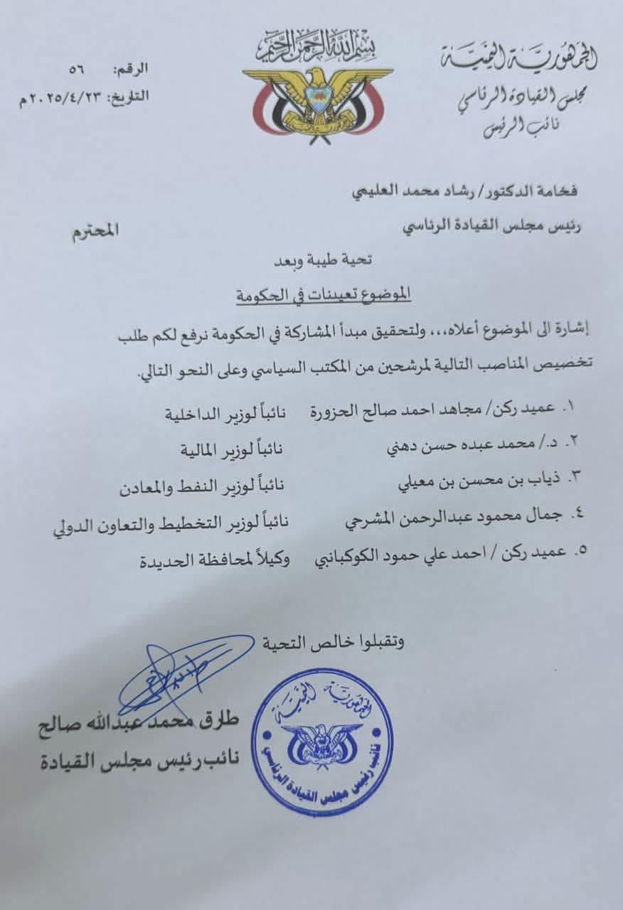 واكدت الوثيقة الصادرة تاريخ 23/4/2025 تقديم (طارق عفاش) مرشحين بأسماء خمسة لشغل مناصب قيادية في وزارات ووكلاء محافظات كمرشحين عن مااسماه مرشحين المكتب السياسي للمقاومة الوطنية التي يراسها