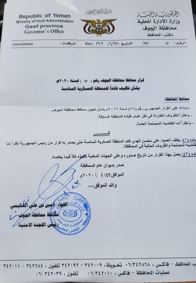 من جانبه رد العكيمي محافظ مارب بقرار اقالة هاشم الاحمر من قيادة المنطقة العسكرية السادسة وتكليف قائدا لها ، اذ حمل القرار رقم ( 5) والذي جاء فيه : قرار محافظ محافظة الجوف .