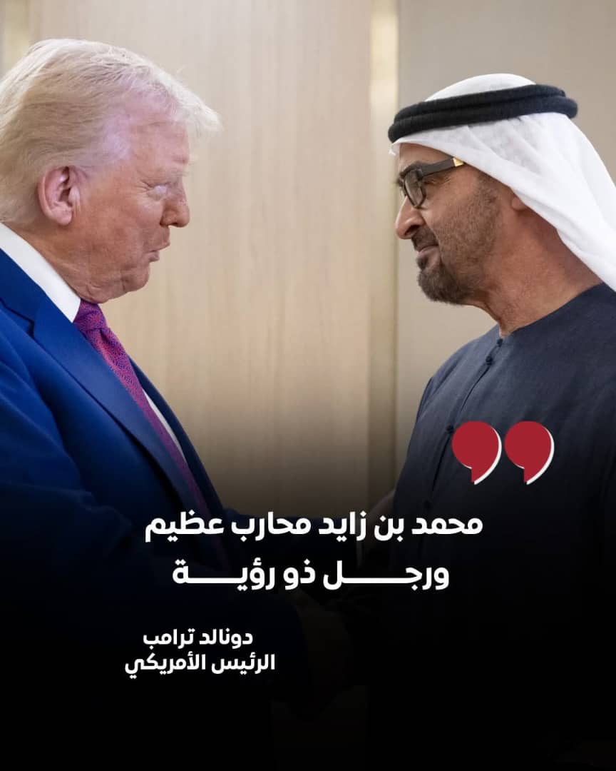 وصف الرئيس الأمريكي دونالد ترامب، الشيخ محمد بن زايد آل نهيان رئيس دولة الإماراتةالعربية المتحدة لدى زيارته اليوم للدولة ،بانه محارب عظيم ورجل ذو رؤية.