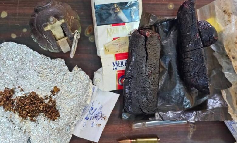 وبناءً على أمر صادر من النيابة العامة، جرى تفتيش منزل المتهم المدعو (م.ع.أ)، البالغ من العمر 31 عاماً ، حيث ضُبط متلبساً وبحوزته ما يقارب ربع كيلو جرام من مادة الحشيش المخدر، وأدوات تستخدم في تعاطي مادة الشبو وبيع المواد المخدرة، فضلاً عن قنبلة يدوية وكمية من الذخيرة.