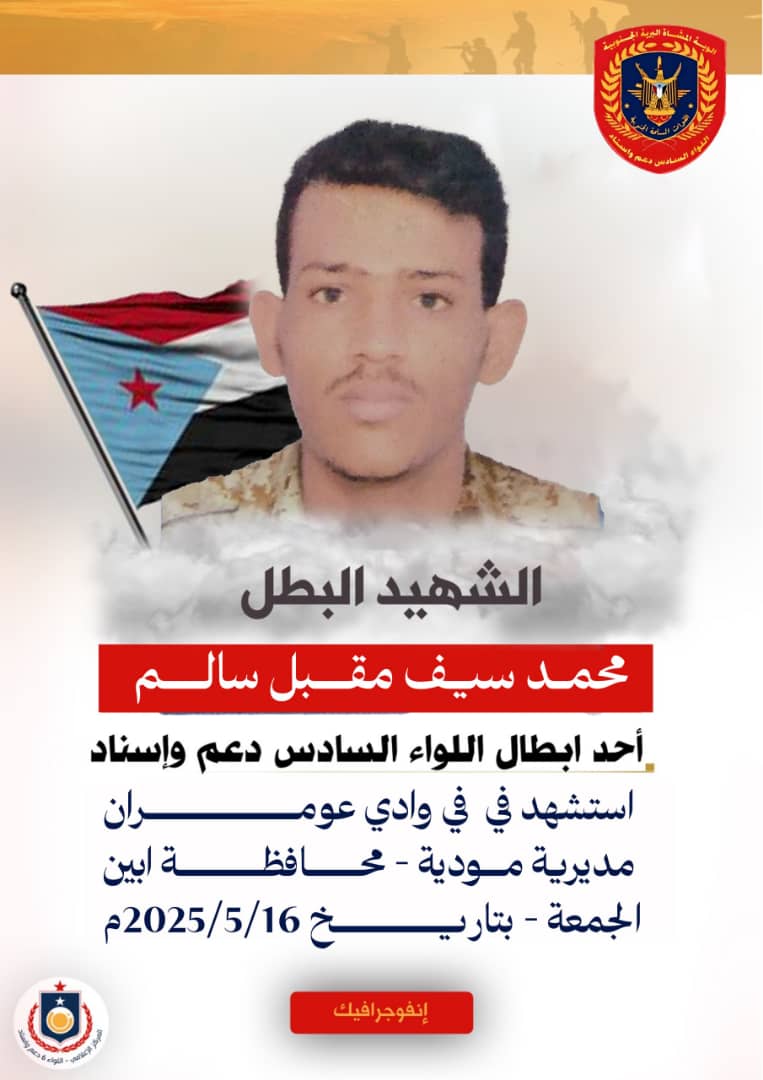 وأكد مصدر عملياتي أن أبطال اللواء السادس دعم وإسناد اشتبكوا مع العناصر الإرهابية في مواقع الكسارة وسط الوادي، واستخدمت العناصر الارهابية الطيران المسير الذي تحصلت عليه من مليشيات الحوثي الارهابية في محاولة بائسة لارباك القوات الجنوبية فيما أسفر الاشتباك عن مصرع وجرح عدد من العناصر الارهابية ، بينما ارتقى أحد أبطال القوات شهيداً أثناء أداء واجبه الوطني بكل بسالة.