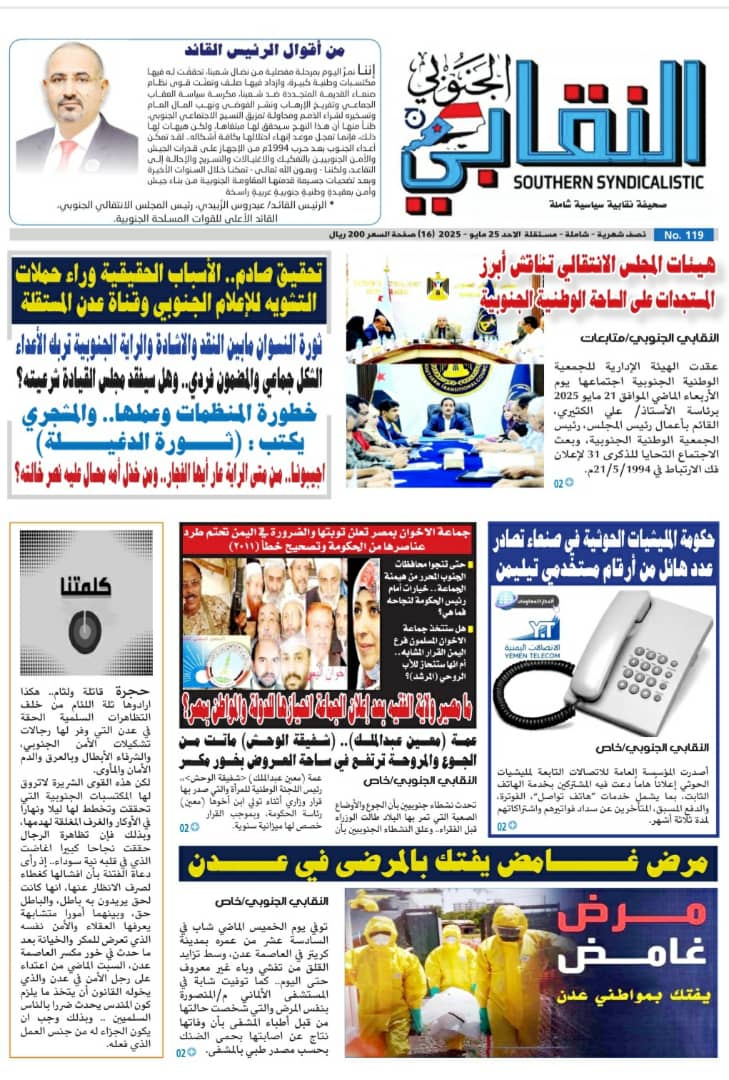 صحيفة النقابي الجنوبي وعددها الجديد( 119) ..يوم غدا الأحد الموافق 25/5/2025