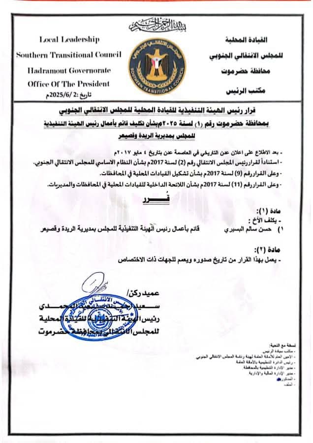 قرار رئيس الهيئة التنفيذية للقيادة المحلية للمجلس الانتقالي الجنوبي بمحافظة حضرموت رقم (1) لسنة ٢٠٢٥م بشأن تكليف قائم بأعمال رئيس الهيئة التنفيذية للمجلس بمديرية الريدة وتصيعر