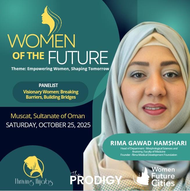 رئيسة قسم العلوم المورفولوجية والتشريح بكلية الطب ومؤسسة ريما للتنمية الطبية في الجلسة الحوارية التي تحتضنها العاصمة العمانية مسقط في 25 أكتوبر 2025، بعنوان “نساء المستقبل” تحت شعار “تمكين المرأة وصياغة المستقبل”.