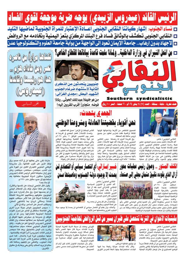 يوم غداً الأحد الموافق 14 يناير 2024م ..صحيفة النقابي الجنوبي في عددها الجديد 91