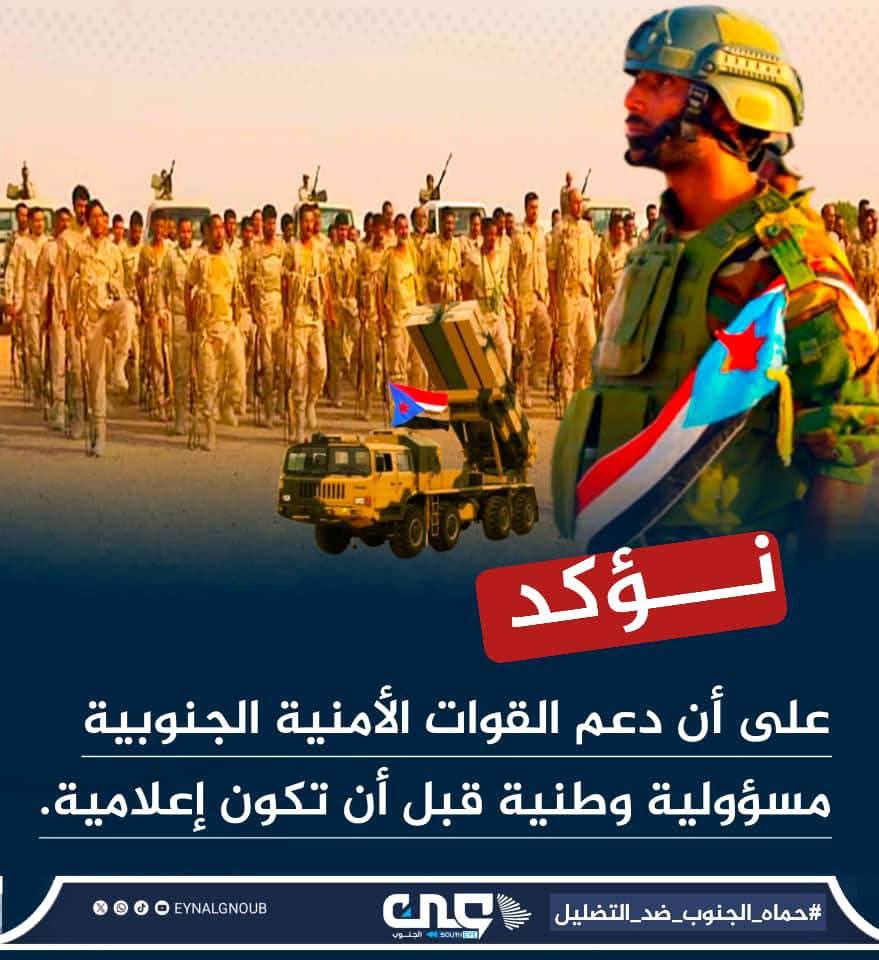 كما نحذر بشدة من هذه الحملات المعادية الممنهجة للتشويه والتضليل التي تستهدف المؤسسة الأمنية الجنوبية، والتي تقودها جهات معادية تسعى لضرب النسيج الوطني وإضعاف الروح المعنوية. إن هذه الحملات لا تستهدف أفرادًا، بل تستهدف الجنوب كله .