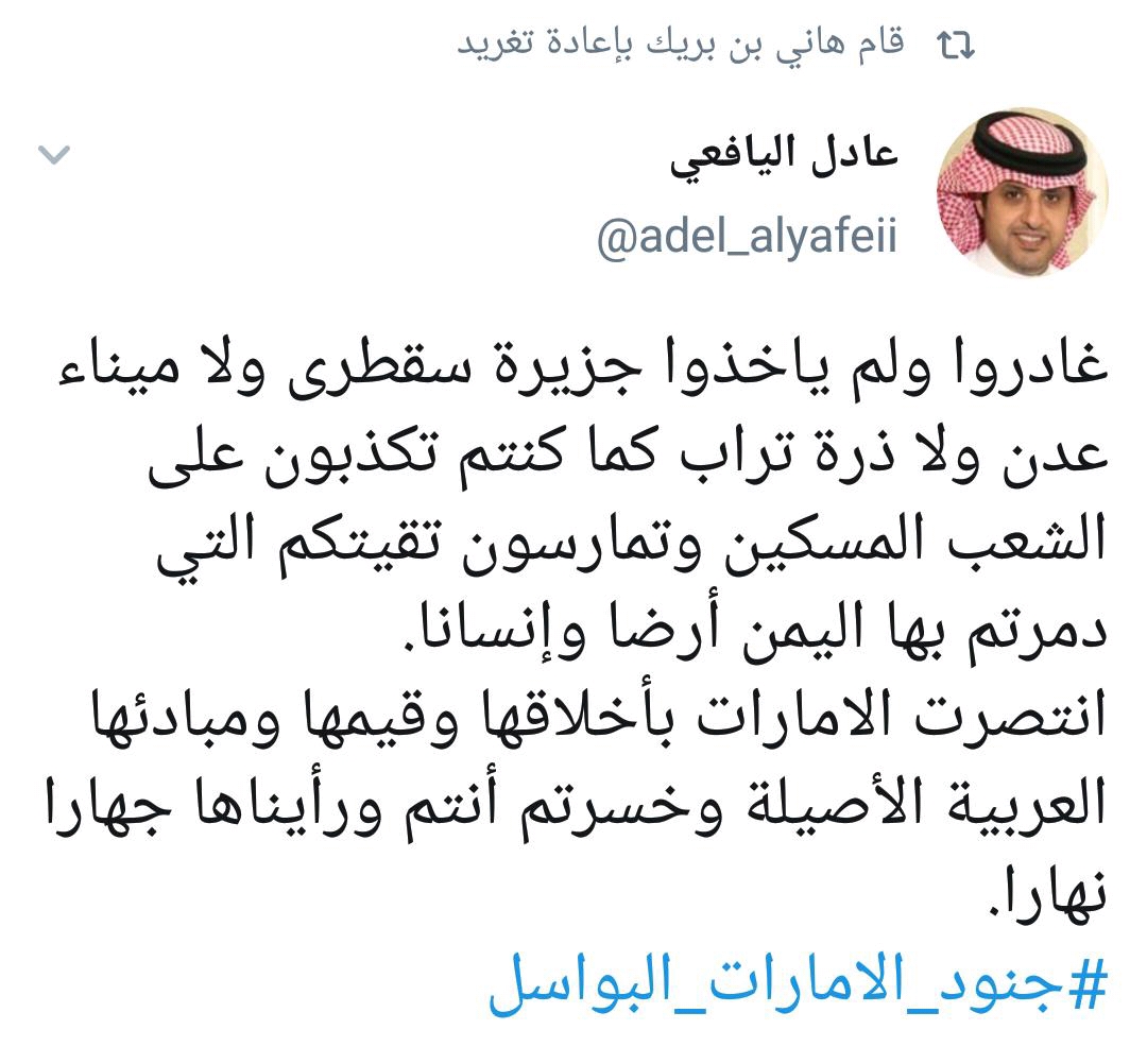 وقد وجه الصحفي الجنوبي عادل اليافعي للمليشيات الاخوانية رسالة عبر تويتر حيث قال غادروا ولم يأخذوا جزيرة سقطرى ولا ميناء عدن كما كنتم تكذبون على الشعب المسكين