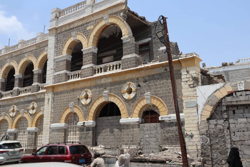 تحطمت أجزاء من واجهته الجميلة ذات الطابع المعماري الفيكتوري، وانهارت بعض الأعمدة، بينما تُغلق الجدران الإسمنتية المداخل، وكأنها تحبس ذاكرة عدن خلف الركام.
