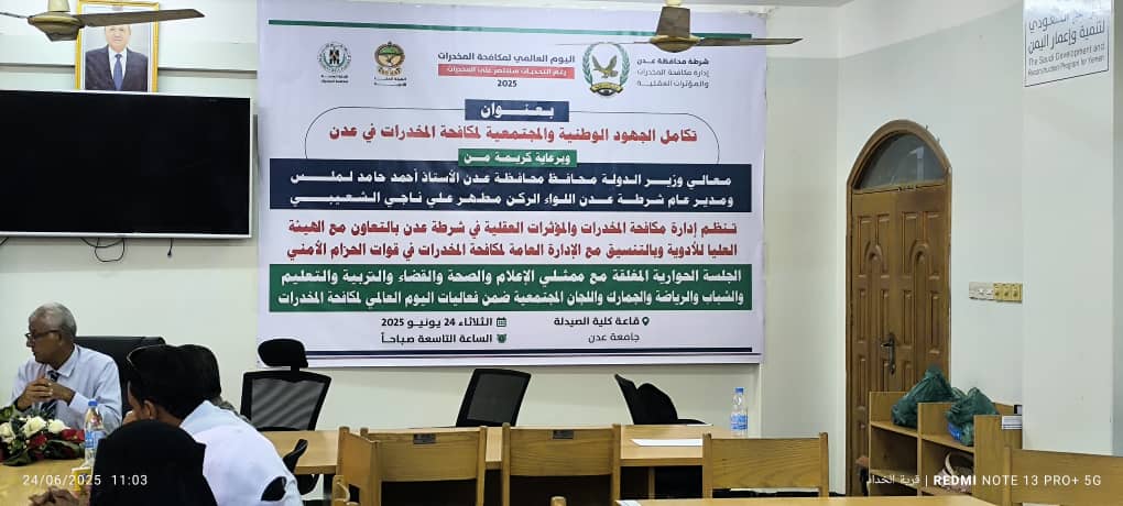 الجلسة، التي احتضنتها قاعة كلية الصيدلة بجامعة عدن، جاءت برعاية كريمة من معالي وزير الدولة محافظ عدن الأستاذ أحمد حامد لملس، واللواء الركن مطهر علي ناجي الشعيبي، مدير أمن شرطة عدن، وهدفت إلى تعزيز تكامل الجهود الوطنية والمجتمعية في مواجهة آفة المخدرات، والبحث في السبل الكفيلة بتوحيد وتطوير مسارات مكافحتها.