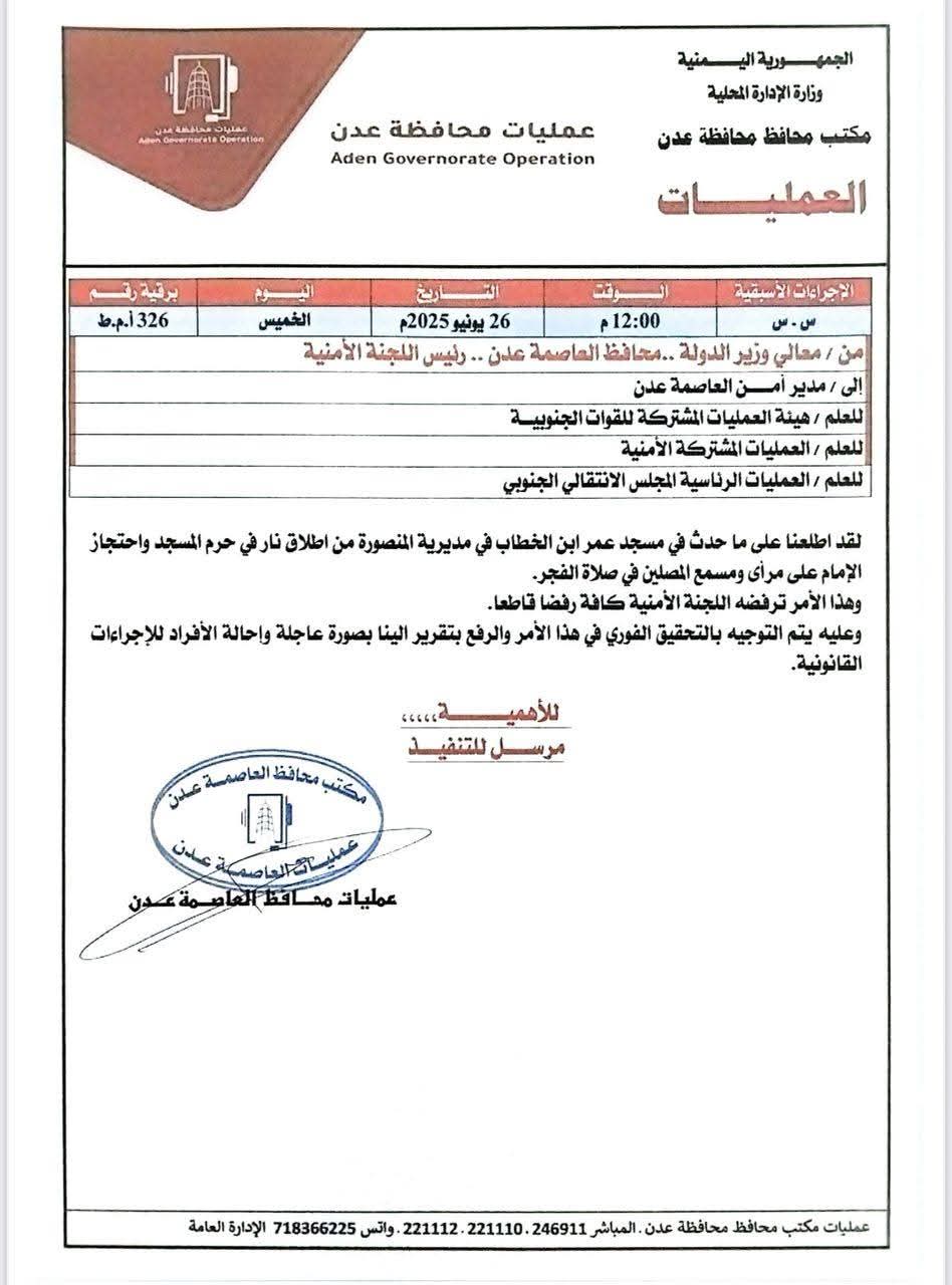 وجاء في نص الوثيقة الصادرة عن عمليات محافظة عدن: “لقد طالعنا على ما حدث في مسجد عمر بن الخطاب في مديرية المنصورة من إطلاق نار في حرم المسجد واحتجاز الإمام على مرأى ومسمع المصلين في صلاة الفجر.