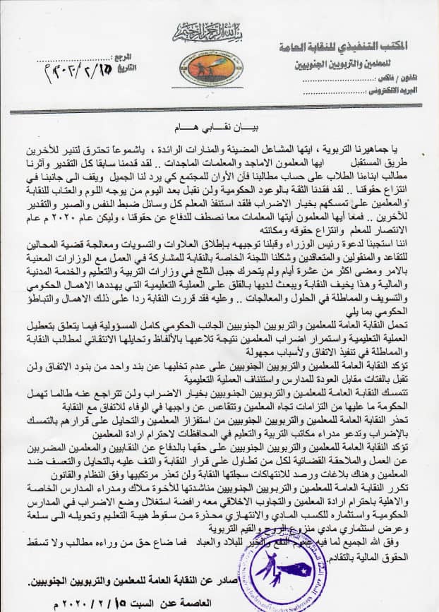 صادر عن النقابة العامة للمعلمين والتربويين الجنوبيين.