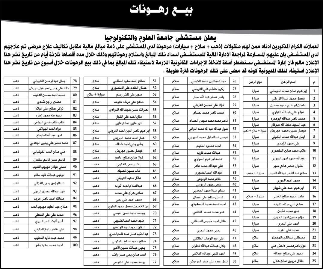 ودعا المستشفى الأسماء المذكورة في الإعلان إلى “الإسراع لمراجعة ما عليهم من مديونية إلى إدارة المستشفى لسداد المبالغ واستلام رهوناتهم في مدة أقصاها ثلاثة أيام، مالم ستضطر المستشفى لبيعها في غضون أسبوع”.