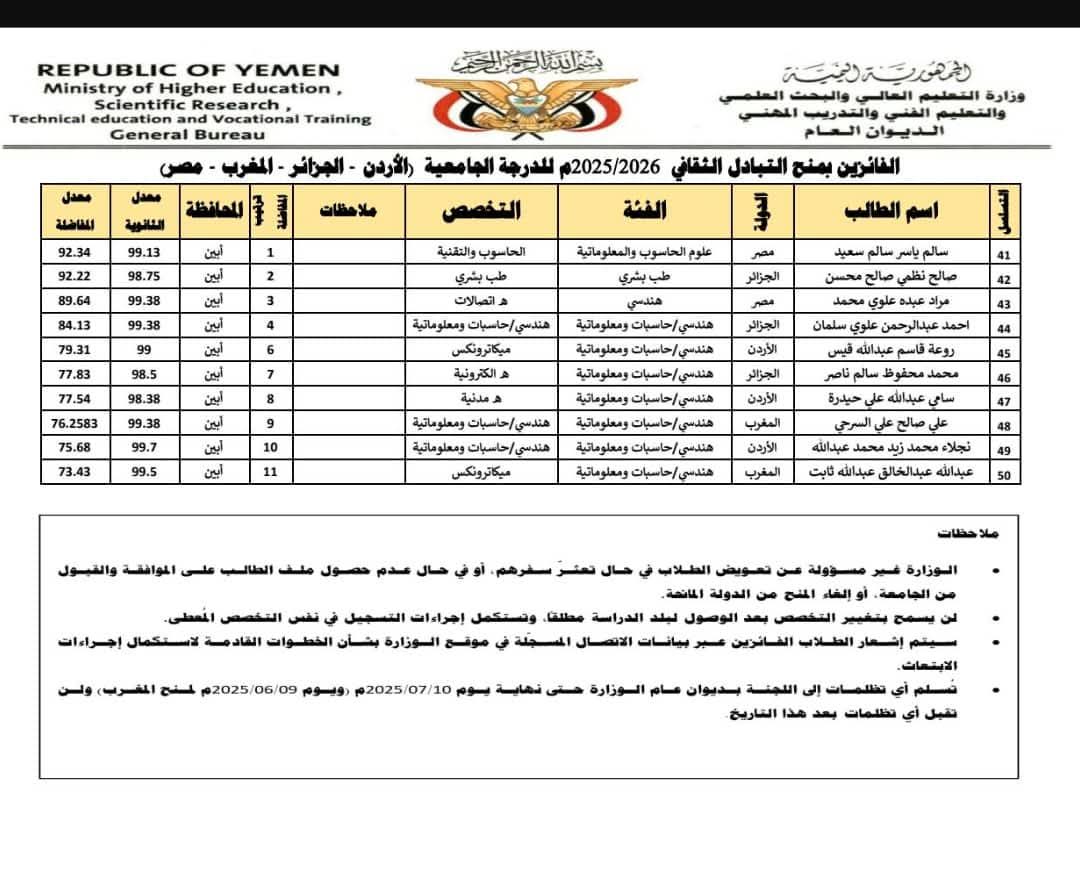 الطالب سامي عبدالله علي حيدرة، الحاصل على معدل 99.38% في الثانوية العامة، سيواصل دراسته في تخصص هندسة الاتصالات والمعلوماتية في المملكة الأردنية الهاشمية، بعد أن جاء اسمه ضمن قائمة الطلاب المبتعثين إلى الأردن بحسب الوثيقة الرسمية الصادرة عن الوزارة.