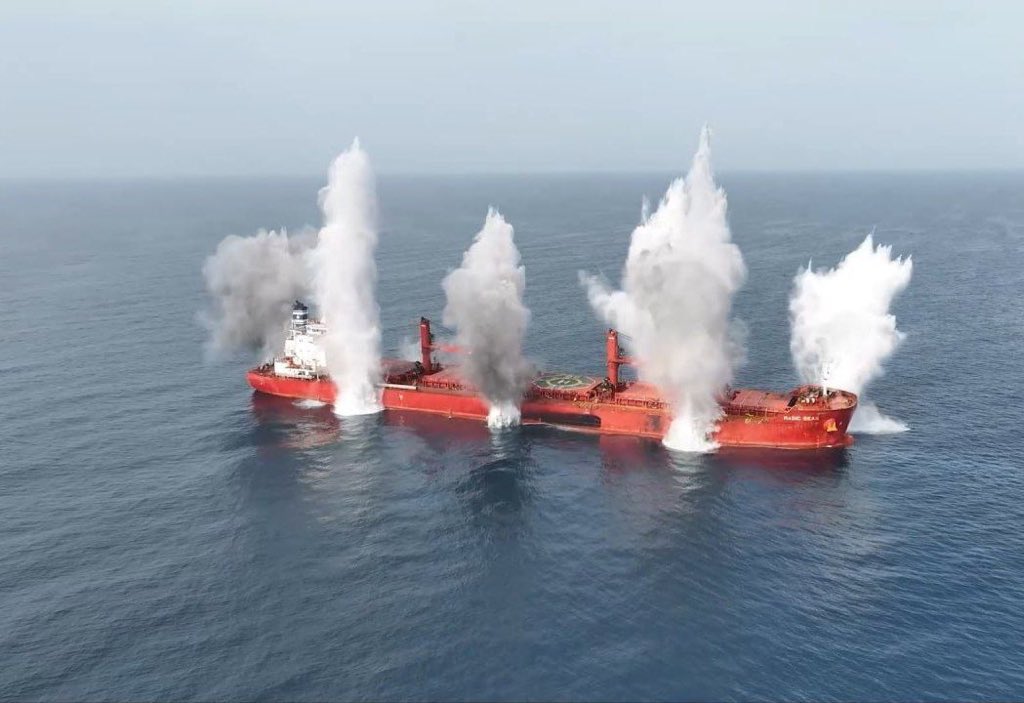 وأعلنت مليشيات الحوثي في اليمن مسؤوليتها عن استهداف السفينة التي تبدو في الصور التي التُقطت لاحقًا وكأنها تعرضت لانفجار داخلي أو تفجير من جوانبها، وليس لصاروخ تقليدي كما هو متعارف في عمليات القصف البحري.